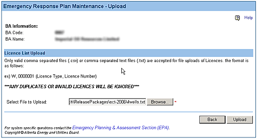 A sample of the Emergency Response Plan Maintenance Upload screen. |