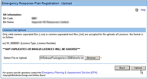 A sample of the Emergency Response Plan Registration Upload screen. |