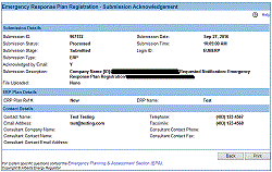 The Submission Acknowledgement screen shows you the details of your Emergency Response Plan just sent to the AER.