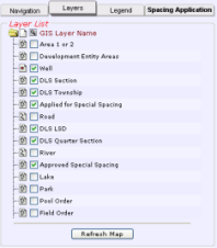 Related map features are grouped into layers. To avoid over-posting, each map layer has a maximum map scale at which it displays. For details on displaying the attributes of wells, fields, pools, and spacing, see Viewing spacing attributes.