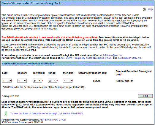 A sample of the Base of Groundwater Protection Query Tool. |