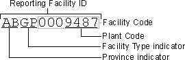 - The Reporting Facility ID is an 11-character code that uniquely identifies all reporting facilities. It includes a Province indicator, Facility Type indicator and the Plant code. Here is an explanation of these components.