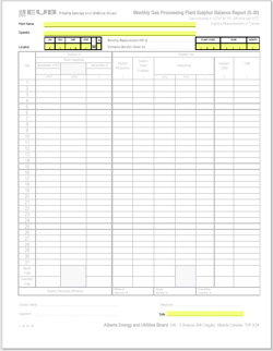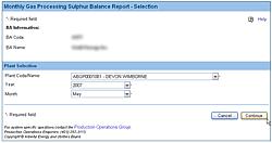 You must know the Reporting Facility ID, the year, and month you will be reporting sulphur balance data for before using this screen. The paper S-30 form required you to specify the Plant Name, Operator, Location, and Plant code to identify the facility. All of this has been replaced by simply selecting the Reporting Facility ID.
